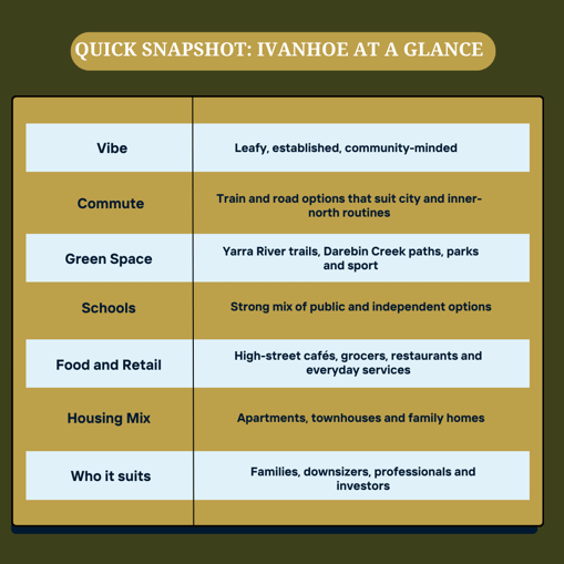 Ivanhoe has a rare “stickiness factor”. Families come for respected schools, green space and an easy daily rhythm. Downsizers stay for village errands, café culture and housing that can suit changing needs. Professionals love the single-train lifestyle and quick access to key inner-north hubs. This guide is designed to be practical and map-friendly, with simple checkpoints you can use on inspections.